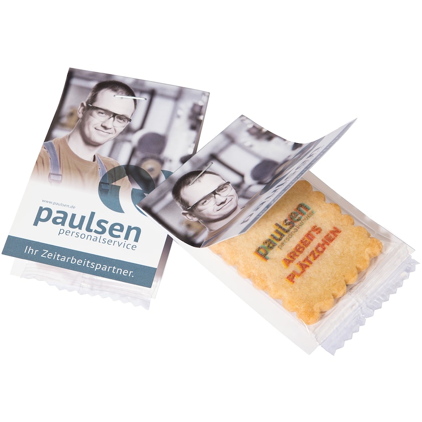 Frollino al burro con cartolina stampata digitalmente. Questo frollino al burro è al delizioso gusto di vaniglia. Sia le pareti esterne della cartolina che il lato superiore del biscotto vengono stampati digitalmente. La stampa sul biscotto viene realizzata con un colore al caramello. Ecco un modo buono e divertente di fare pubblicità!