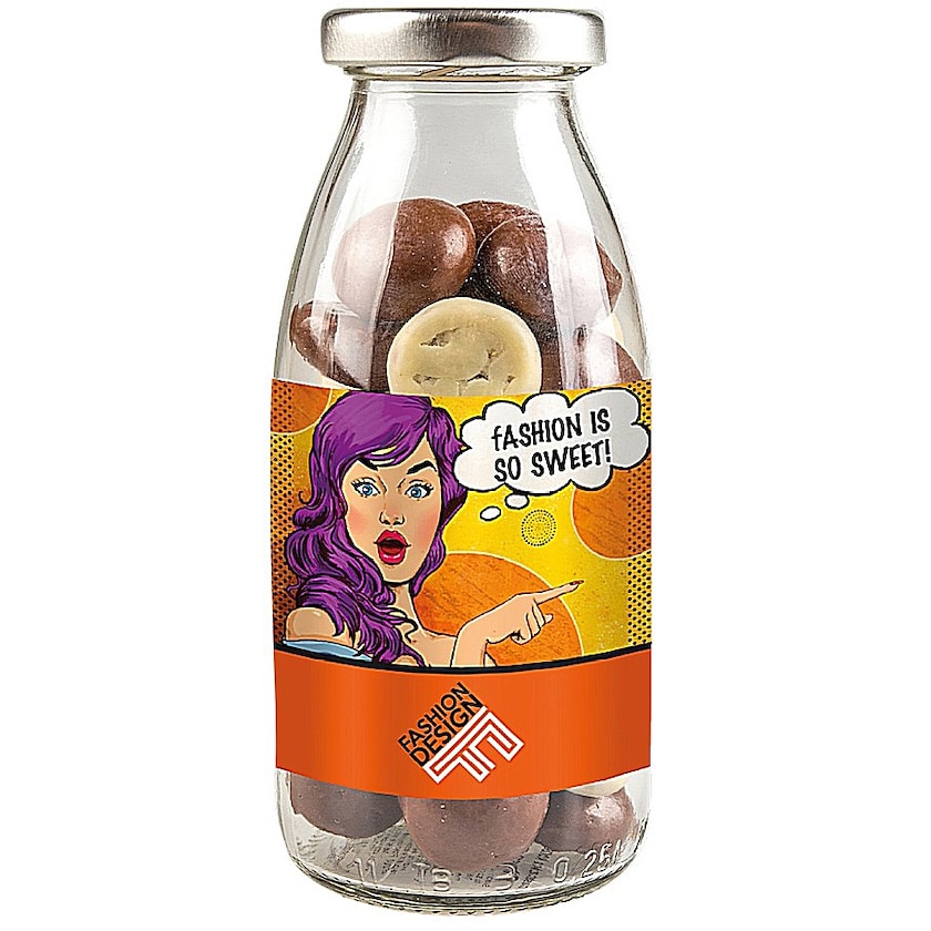 Bottiglia di vetro ripiena di 130 grammi di biscotti in formato mini. La bottiglia contiene i gusti misti milk, white e dessert. L'etichetta viene personalizzata con stampa digitale interamente a vostro desiderio. Un gadget promozionale molto efficace!