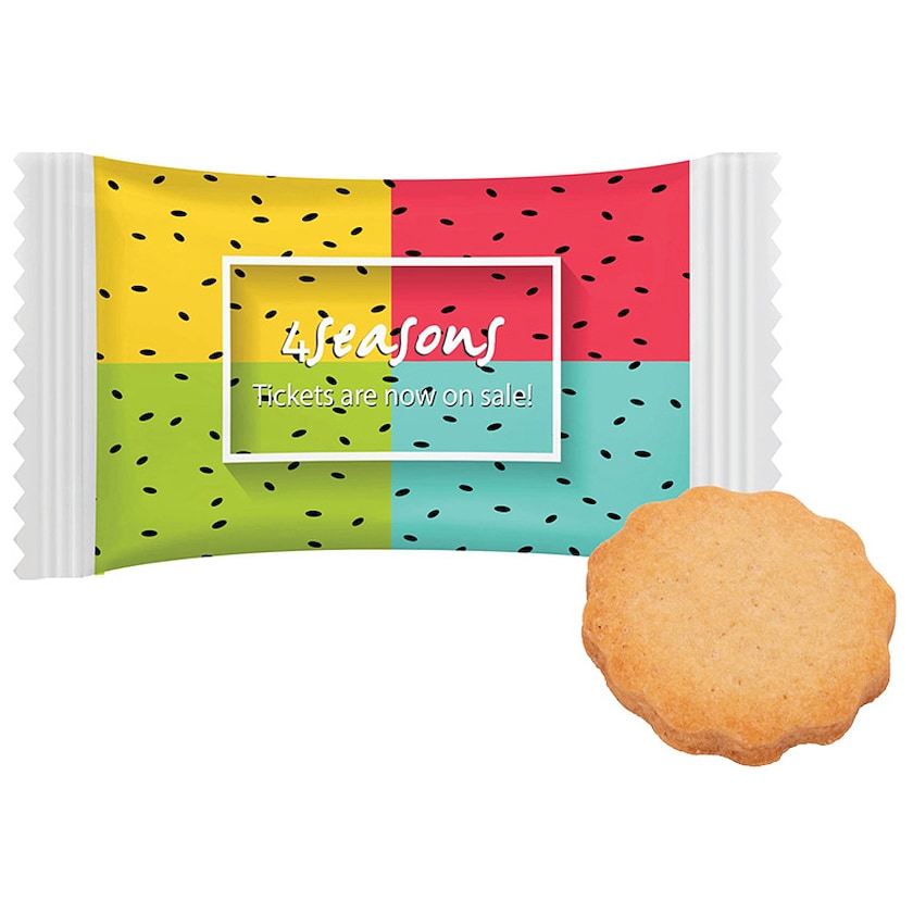 Delizioso biscotto al burro in flowpack. L'intero pacchetto è stampato come desiderato. Perfetto per il caffè!