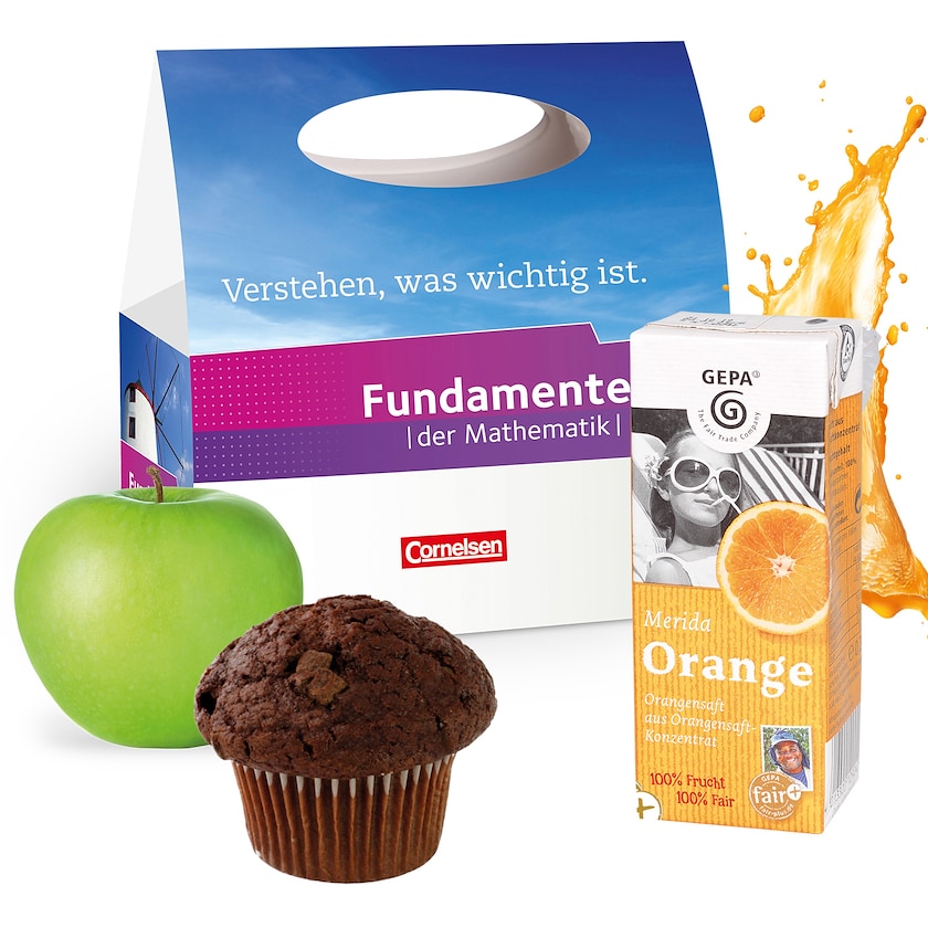 Scatola di carta personalizzata con stampa digitale con muffin, mela e succo di arancia. I muffin sono disponibili nei gusti cioccolato oppure gocce di cioccolato. Le mele possono essere rosse o verde a seconda della stagione e della disponibilità. Il cartone del succo contiene 20 cl di succo. Un'allegra merenda!