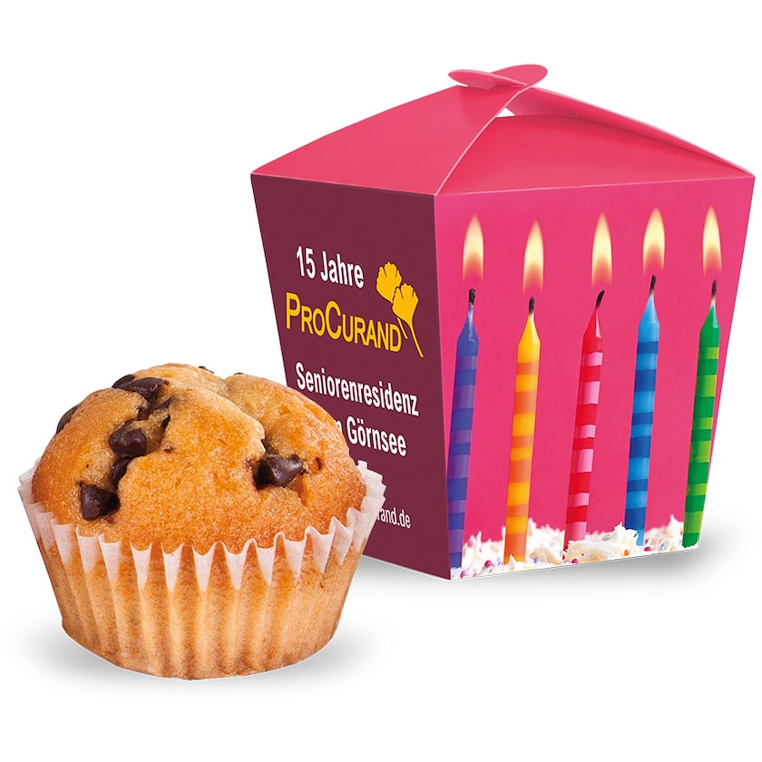 Piccolo muffin in un'allegra confezione di carta. Scegli tra tre deliziosi gusti. L'intera confezione di carta viene personalizzata secondo i tuoi desideri.