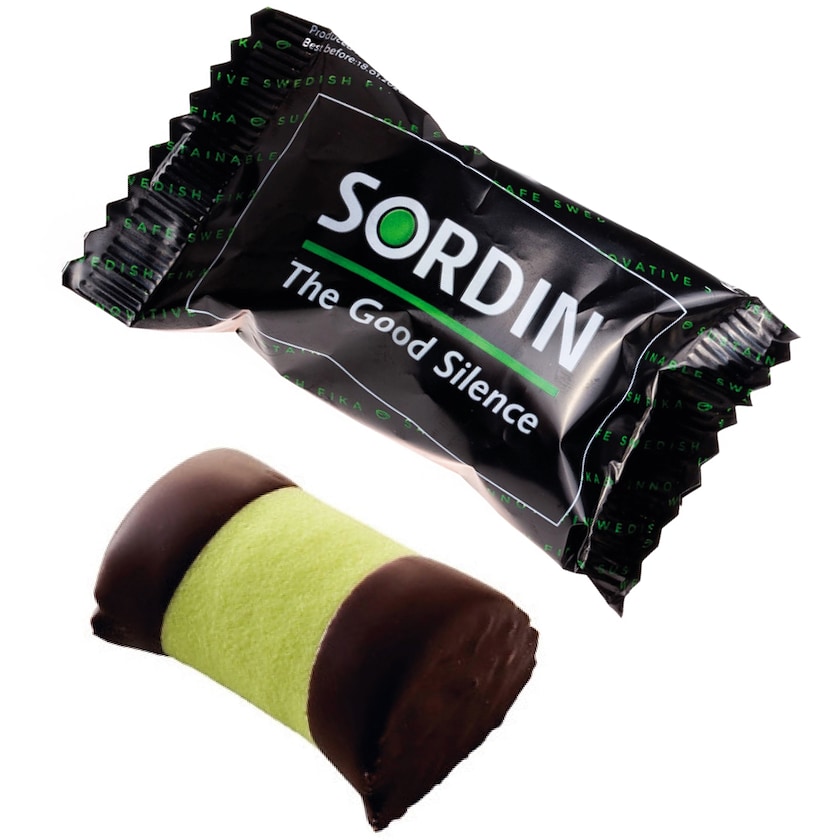 Piccolo punschrulle in confezione personalizzata. Il punschrulle è avvolto in marzapane al gusto di arak e coperto di cioccolato. L'intera confezione viene personalizzata secondo i vostri desideri.