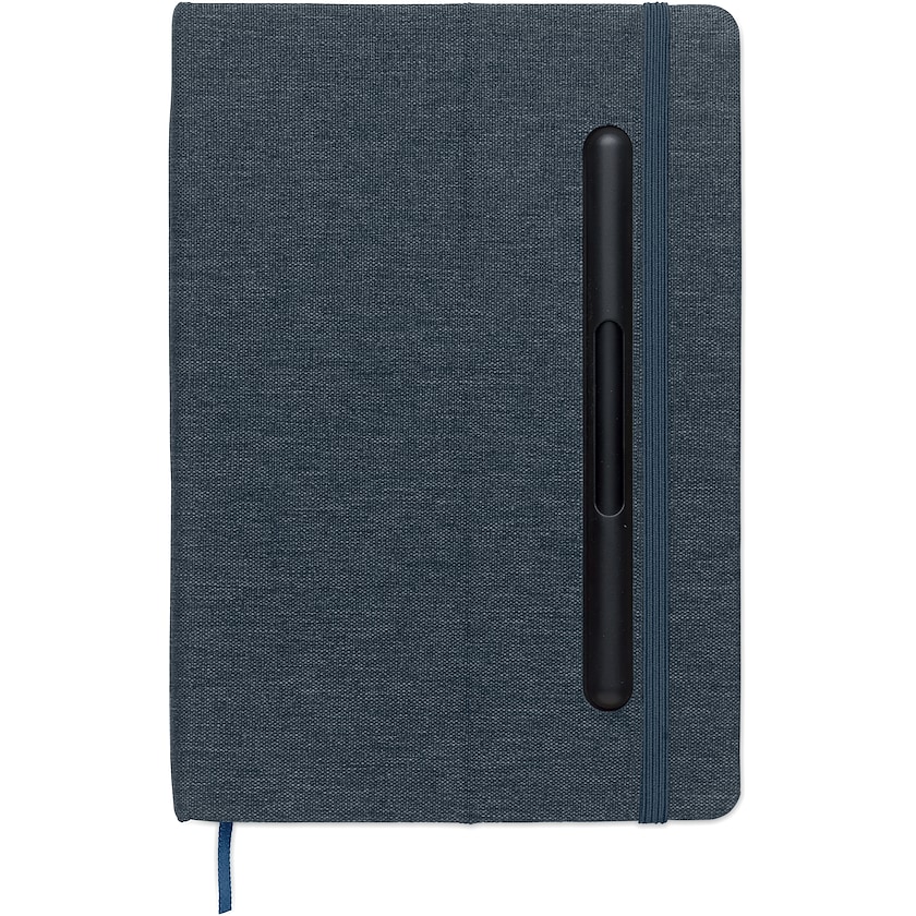 Quaderno con penna e supporto per cellulare. La copertina dura del quaderno è realizzata in rPET ecologico. L'inserto contiene 96 fogli a righe in carta ecologica e riciclata. La penna ha due punte, una con inchiostro una senza inchiostro.