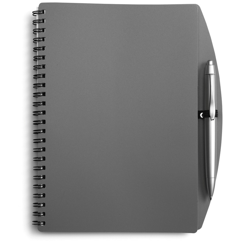 Blocco per appunti in formato A5 con copertina satinata e penna abbinata.