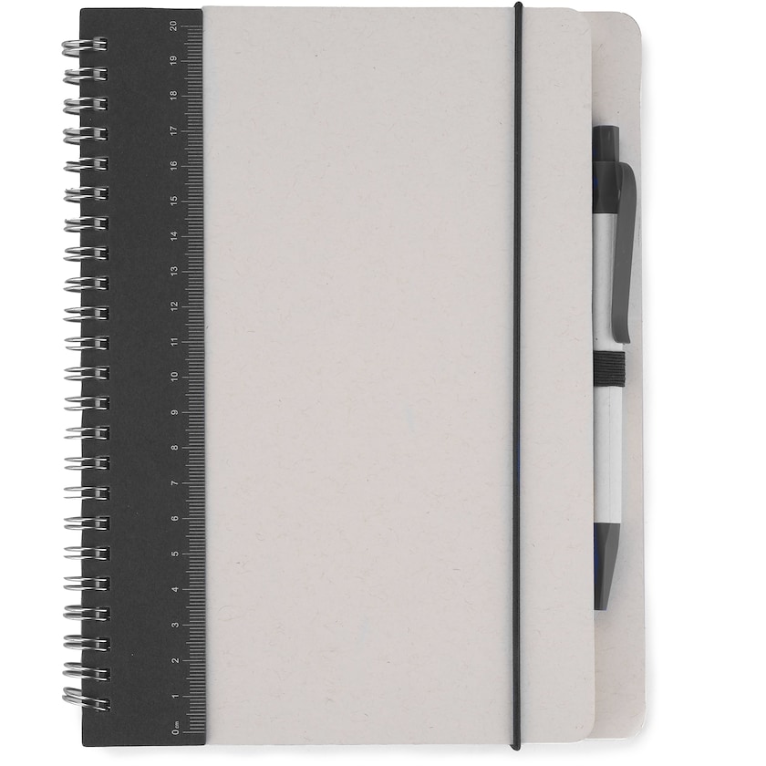 Quaderno a spirale ecologico con righello e penna. La copertina del blocco appunti a spirale, il righello e la penna sono realizzati in cartoni del latte riciclato. L'inserto contiene 70 fogli a righe.