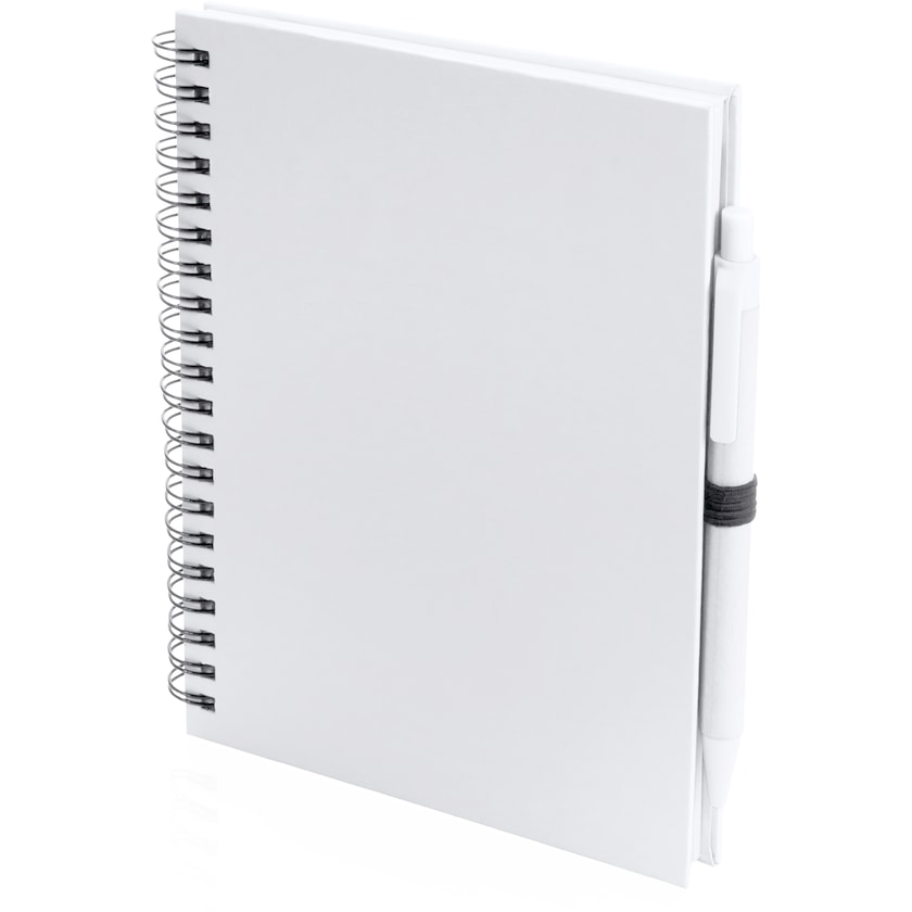Blocco con spirale ecologico in formato A5 con penna abbinata. Il blocco ha 70 pagine bianche di carta riciclata e copertina di cartoncino resistente. La stampa può essere effettuata sia sul blocco che sulla penna.