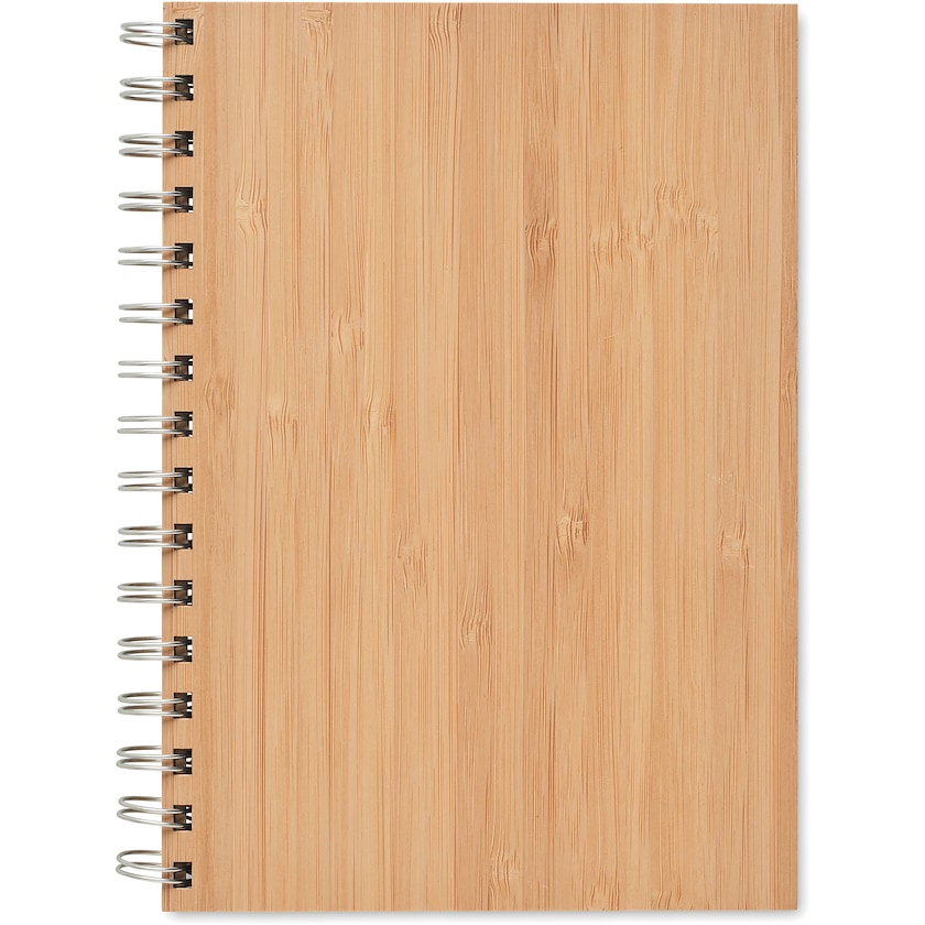 Quaderno sparlato con copertina in bambù. L'inserto contiene 70 fogli a righe. Il logo può essere realizzato con stampa o incisione a laser.