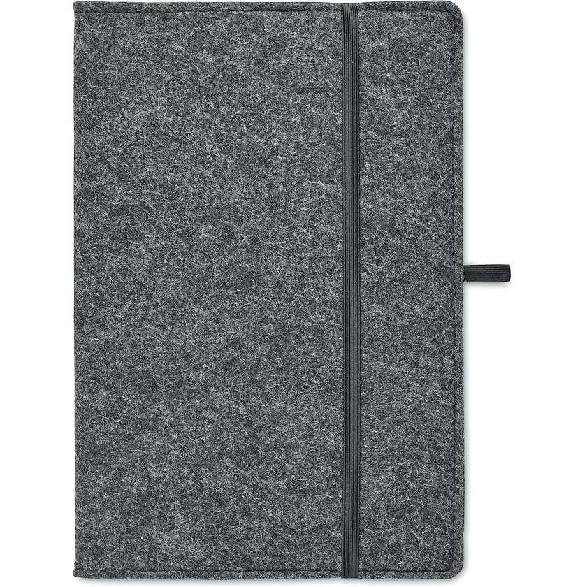 Quaderno con copertina in feltro di materiale riciclato. L'inserto contiene 80 fogli a righe di carta riciclata. La copertina è realizzata in rPET, ovvero bottiglie PET riciclate.