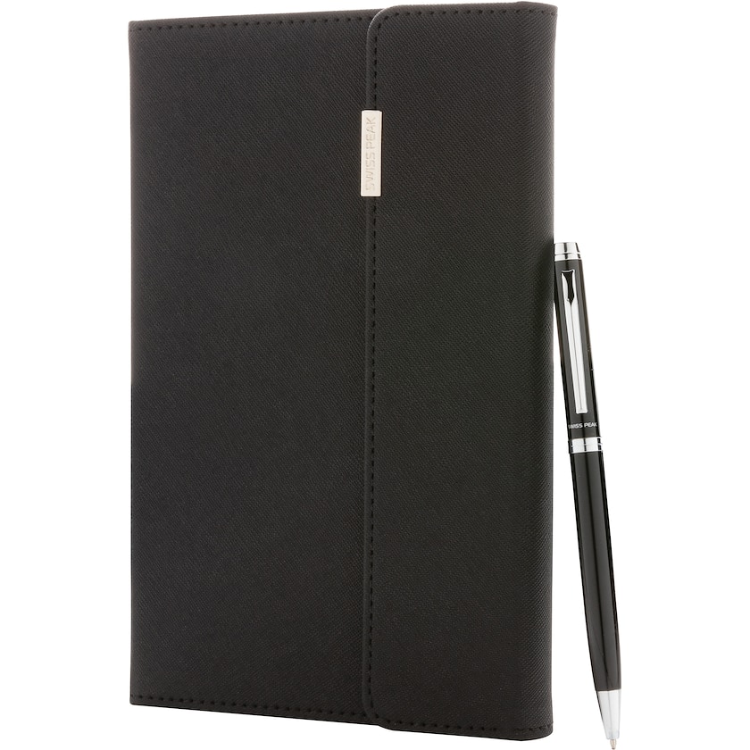Set esclusivo con quaderno e penna. Questo quaderno vanta una pregiata copertina in finta pelle ed una targhetta in metallo che può essere incisa a laser. Il logo può essere stampato sulla copertina oppure inciso a laser sulla targhetta. Anche la penna può essere personalizzata con incisione a laser.