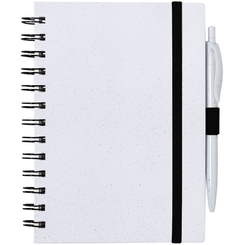 Quaderno a spirale in materiale riciclato. La copertina è realizzata in ABS riciclato e l'inserto contiene 70 fogli a righe in carta riciclata. Anche la penna è realizzata in ABS riciclato. Una scelta ecologica.