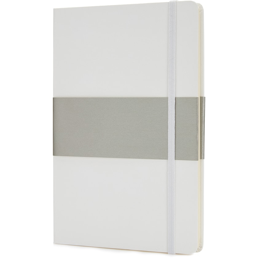 Quaderno A5 con copertina in carta che si allunga sulla parte anteriore e posteriore. Il quaderno ha carta in colore crema con righe nere e un elastico che mantiene il quaderno chiuso.