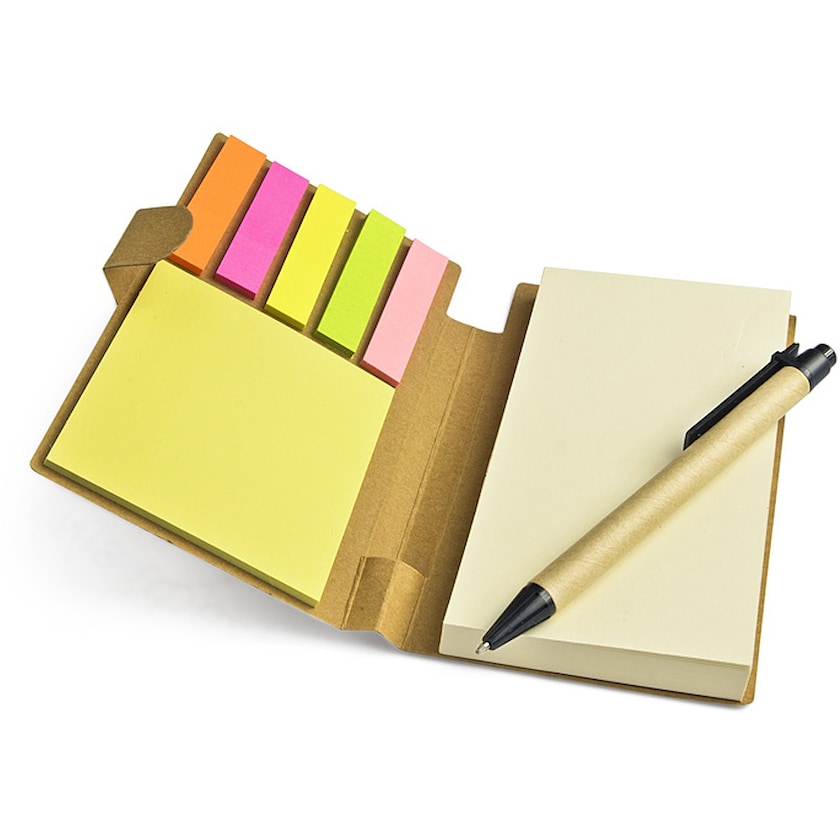 Blocco per gli appunti con penna, segnapagina e memo adesivi. Questa penna è prodotta con plastica e cartone riciclati. Anche il blocco è in cartone riciclato. Ordina dei blocchi ecologici con penna da Axon Profil!
