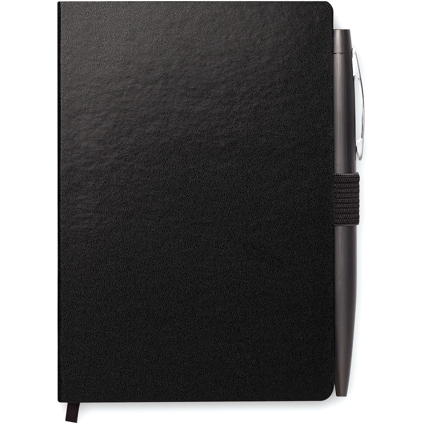 Taccuino in formato A6 con penna. La copertina del taccuino è in simil pelle. L'inserto contiene 72 fogli a righe. La penna è realizzata in metallo e contiene inchiostro nero. Il prezzo di stampa si riferisce solo alla stampa sul taccuino oppure alla stampa sulla penna.
