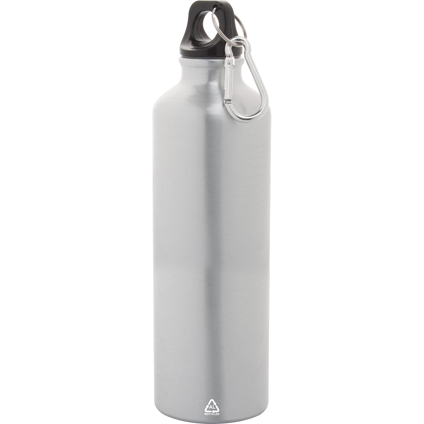 Borraccia da 75 cl in alluminio riciclato. Il tappo è dotato di moschettone. La personalizzazione può essere realizzata con stampa o incisione a laser.
