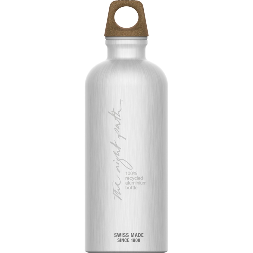Borraccia Sigg in 100% alluminio riciclato. La borraccia è completamente a emissioni zero e il sughero è realizzato in materiale provenienti da fonti rinnovabili che non consuma risorse naturali. Prodotto in Svizzera. Nota il testo stampato sulla borraccia.