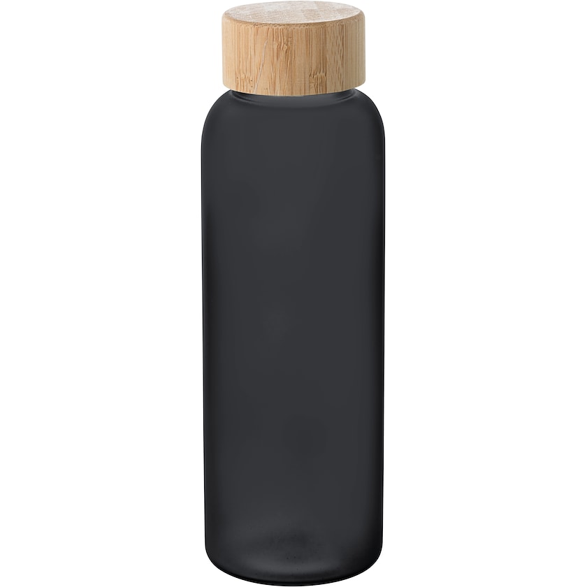Borraccia in vetro con tappo in bambù. Il vetro è borosilicato ed è quindi refrattario e molto resistente. Questa borraccia viene confezionata singolarmente all'interno di una scatola di carta. Il logo può essere stampato al massimo in un colore.