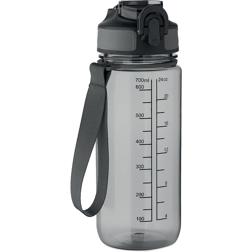 Borraccia ecologica con indicazione del volume stampata. Il tappo si apre con una mano ed è a chiusura ermetica.