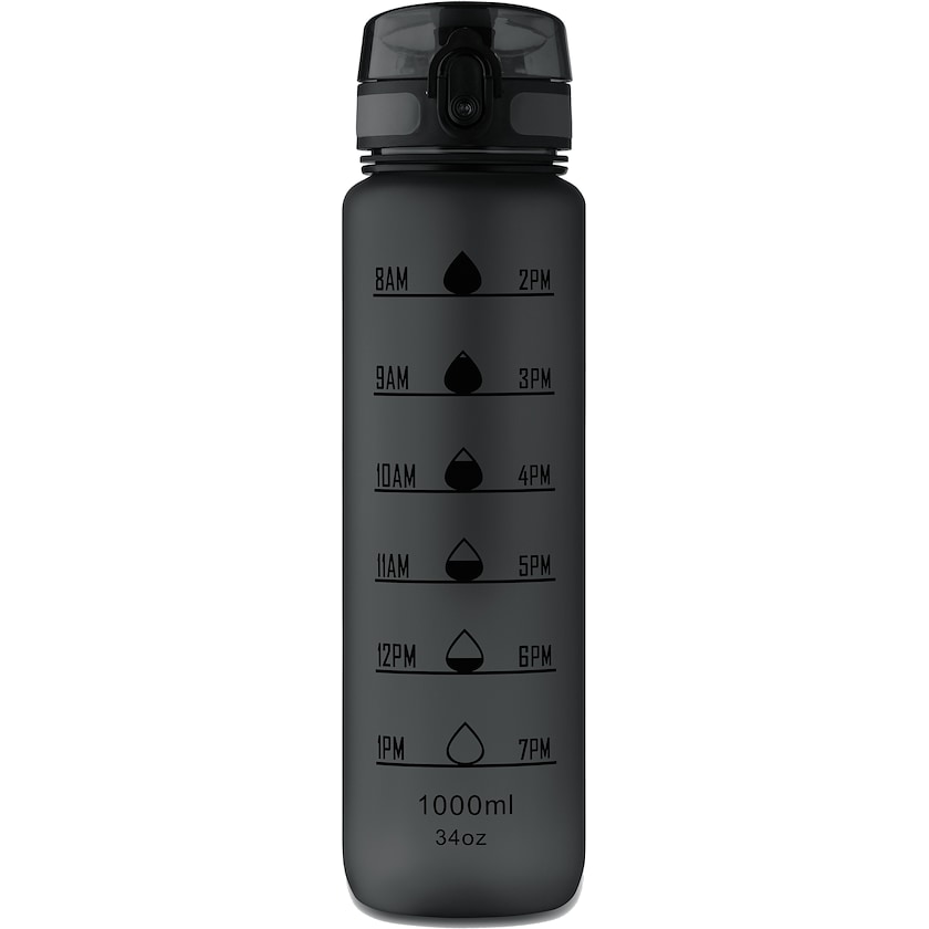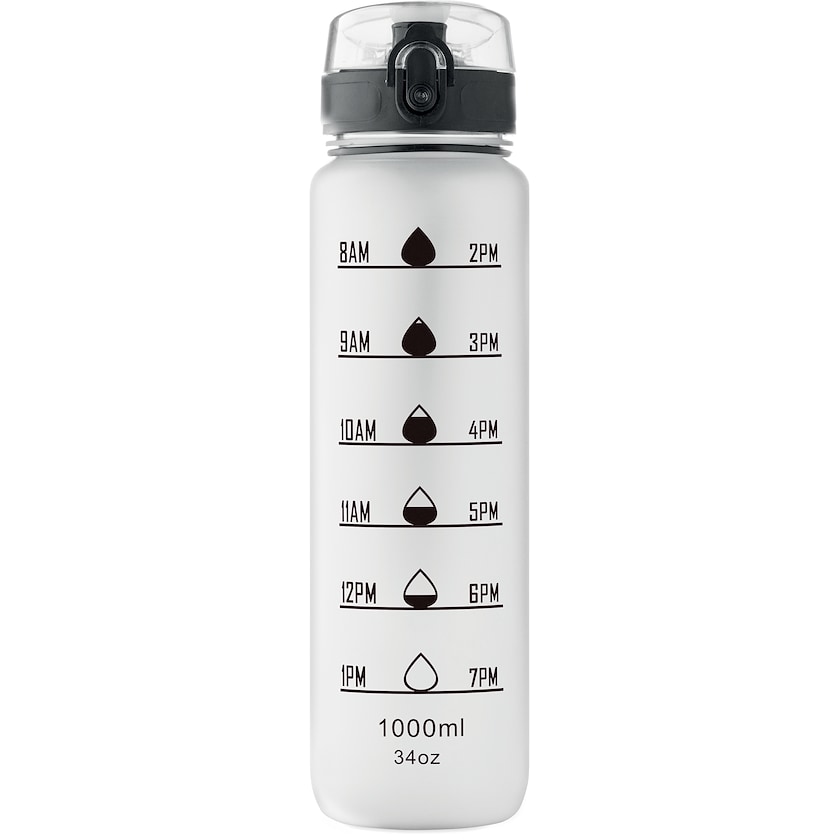 Borraccia in rPET con marcatura di tempo. Il tappo è dotato di chiusura di sicurezza e può essere aperto con una mano. A prova di perdite.