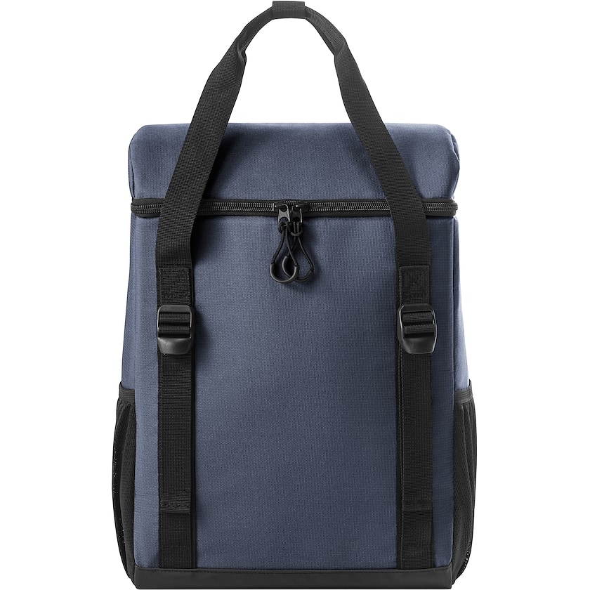 Borsa termica ecologica in versione zaino. Sui lati si trovano delle tasche a rete. Contiene 16 litri. Il tessuto è realizzato in rPET, ovvero bottiglie PET riciclate.