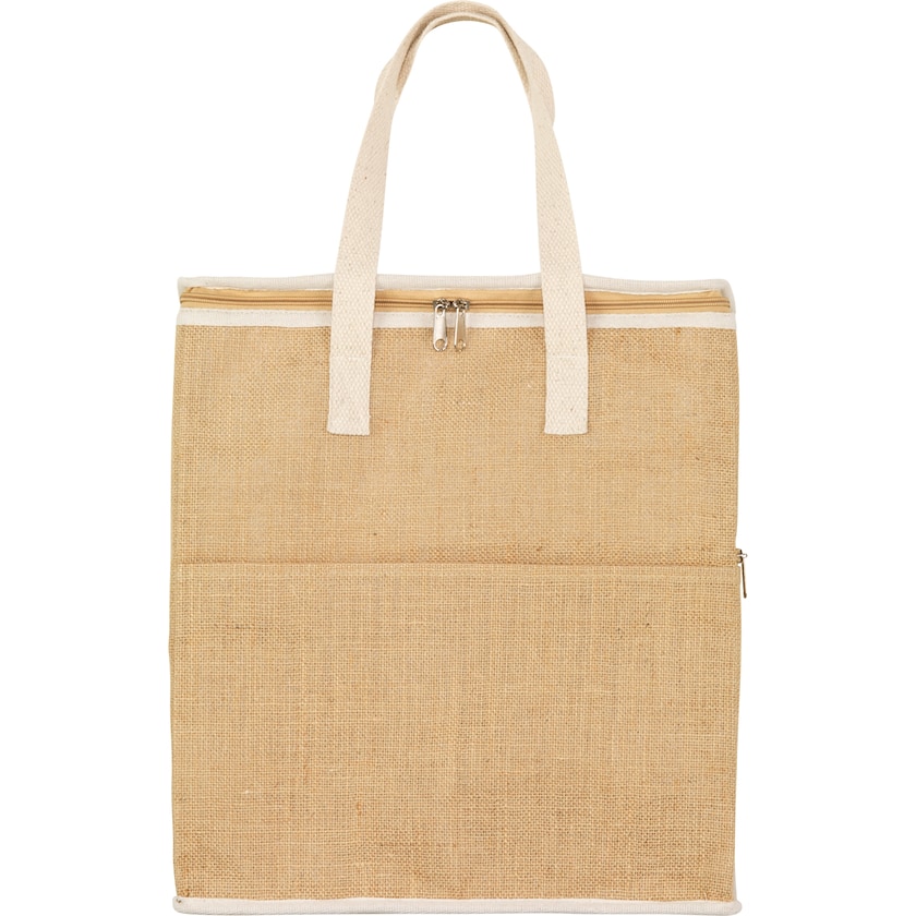 Grande borsa termica in juta e cotone. Sul davanti si trova un'ulteriore tasca per trasportare oggetti che non devono essere tenuti al fresco. Questa borsa termica ha una capienza di 24 litri. È solo possibile la stampa a un colore.