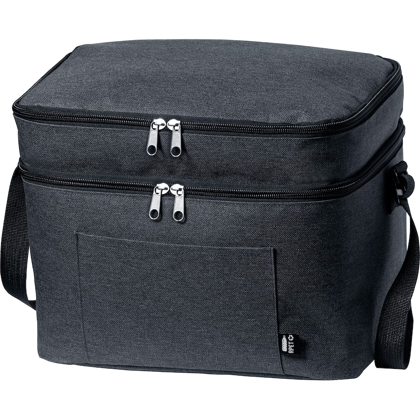 Spaziosa borsa termica con tessuto di materiali riciclati. Questa borsa termica è dotata di due scomparti con cerniera e di una tracolla regolabile.