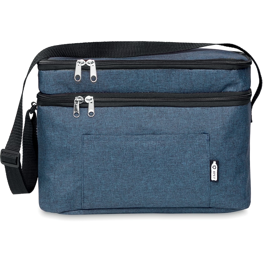 Spaziosa borsa termica personalizzata eco-compatibile. Greenland è realizzata in rPET e foderata in PEVA. Questa borsa frigo è dotata di due scompartimenti spaziosi e di una tasca sul davanti. La tracolla è regolabile.