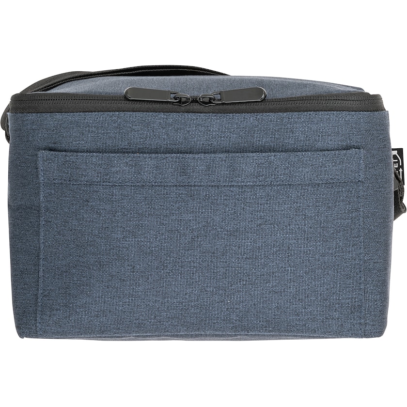 Borsa termica ecologica in rPET. Sul davanti si trova una tasca per piccoli oggetti. Ha una capienza di 7 litri. Sul lato si trova un'etichetta che mostra che è realizzata in rPET ecologico.