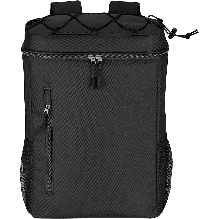 Spazioso zaino termico a un prezzo interessante. Sul davanti si trova una tasca dotata di cerniera e ai lati si trovano delle tasche a rete. Lo schienale e gli spallacci sono imbottiti e traspiranti. Sugli spallacci si trova una fascia catarifrangente. Stampa possibile a un solo colore.