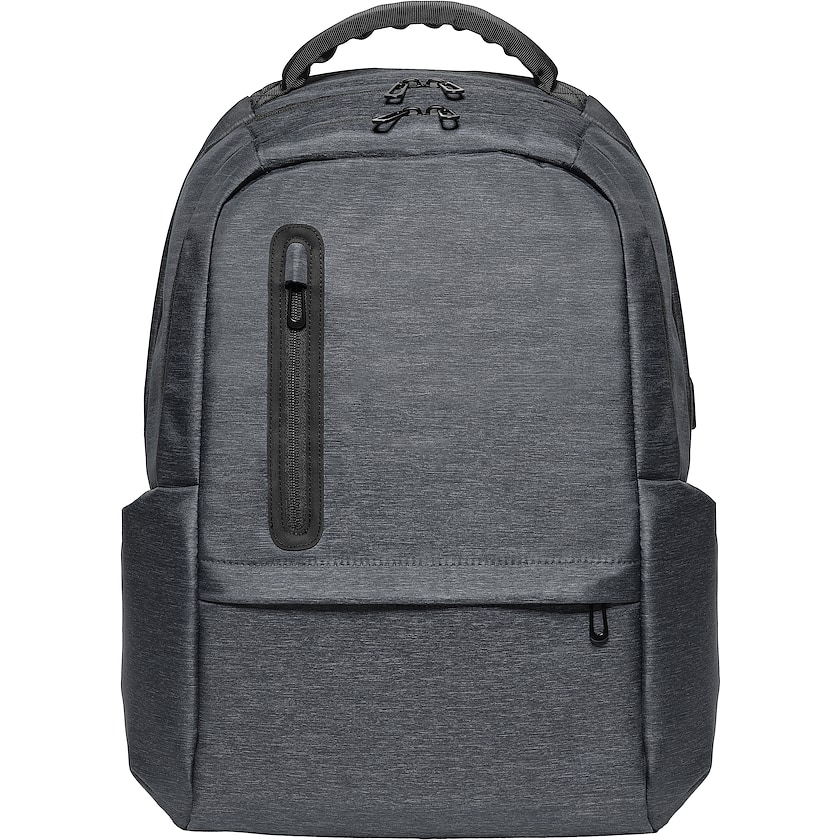 Zaino per PC in tessuto impermeabile. Lo zaino ha due scompartimenti principali. Uno di questi è imbottito e può contenere quasi tutti i portatili fino a 17 pollici. Sul davanti e sui lati si trovano altre quattro tasche. Lo zaino è provvisto di una porta USB e un cavo micro USB per la ricarica del cellulare (un powerbank non è incluso). Sul lato posteriore gli spallacci sono imbottiti.