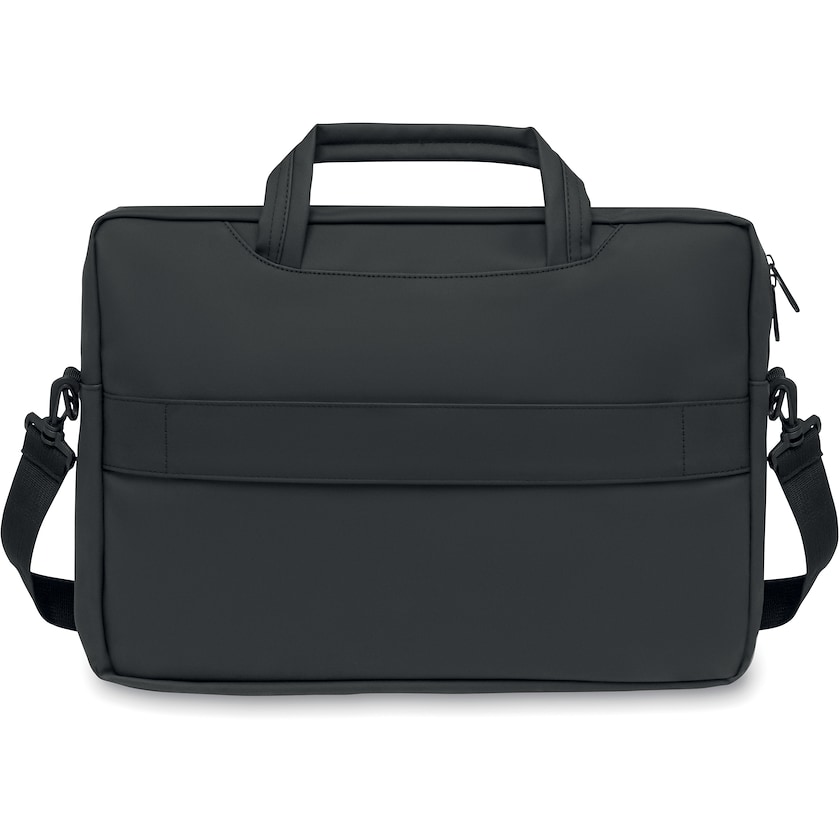 Custodia per PC da 15 pollici personalizzata. Lo scomparto principale è imbottito e sul davanti si trova una tasca con cerniera. Gli spallacci sono regolabili e removibili. Sul retro si trova una fascia per attaccare la custodia a un trolley. Stampa possibile a un solo colore.