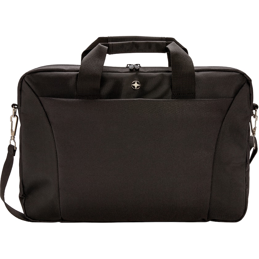 Borsa per PC di Swiss Peak. Per la maggioranza dei laptop da 15 pollici. La borsa ha uno scompartimento imbottito per il portatile e una tasca separata per il tablet. Inoltre contiene una tasca zip per gli accessori minori e una tracolla regolabile e removibile. Senza PVC.