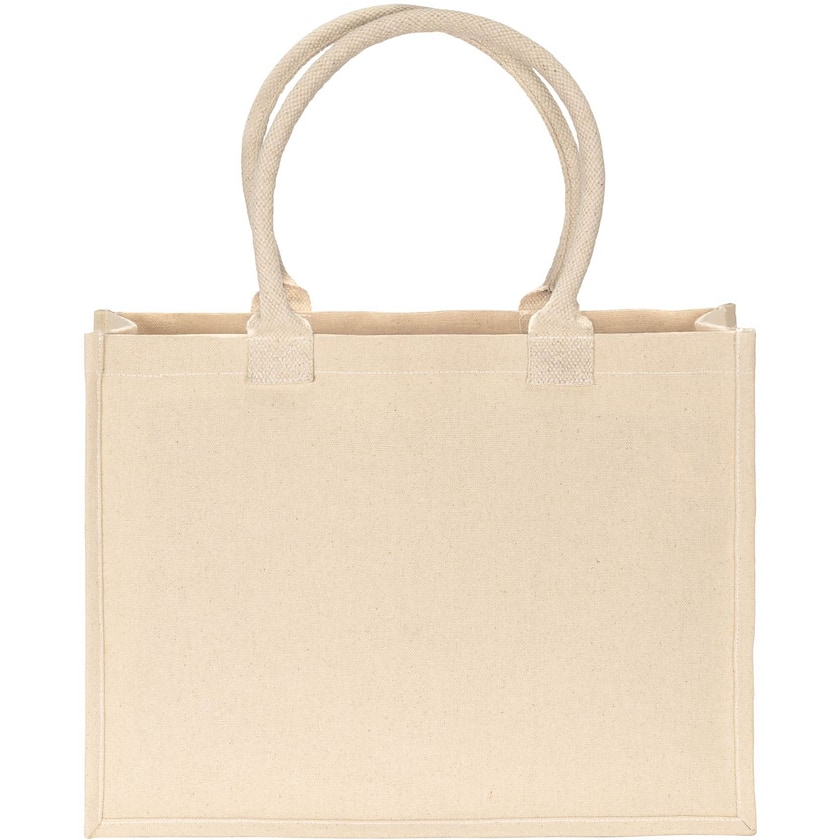 Borsa da spiaggia in cotone riciclato laminato. Il fondo ampio rende la borsa molto spaziosa. I manici hanno una lunghezza che rende facile portare la borsa sia a mano che in spalla. Stampa a un solo colore.