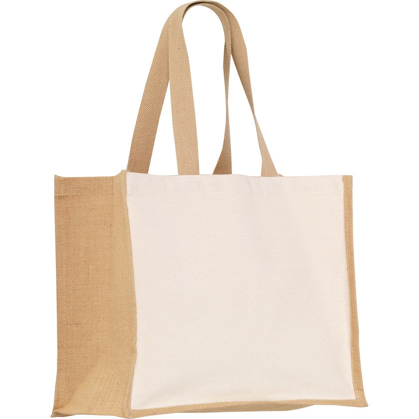 Shopper in juta con dettagli in tela di cotone. La shopper è dotata di manici lunghi. Ecco una shopper di juta resistente e di alta qualità.