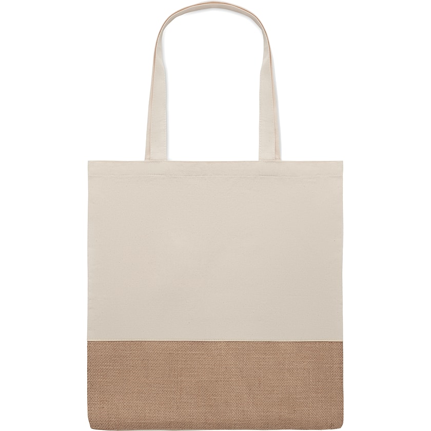Shopper di tela in cotone con parte bassa in juta. La shopper è dotata di manici lunghi. Ecco una shopper in materiali naturali e con tanto charme.