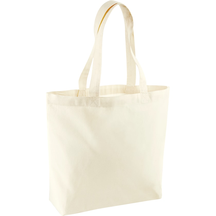Robusta shopper in cotone in 100% cotone biologico. La shopper ha un tessuto color naturale con fondo largo. I manici sono lunghi per permetterne il trasporto a mano o a spalla.