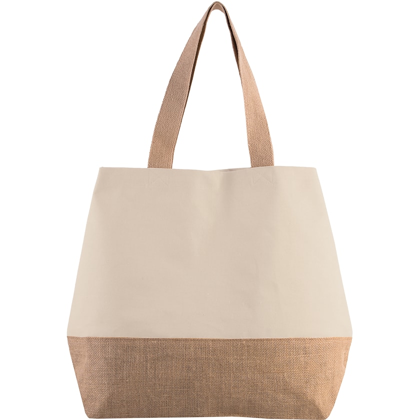 Ampia borsa da shopping in cotone con fondo di iuta. All'interno c'è una tasca portaoggetti con cerniera. Le maniglie sono lunghe 55 cm. La borsa viene tenuta chiusa usando un bottone magnetico.
