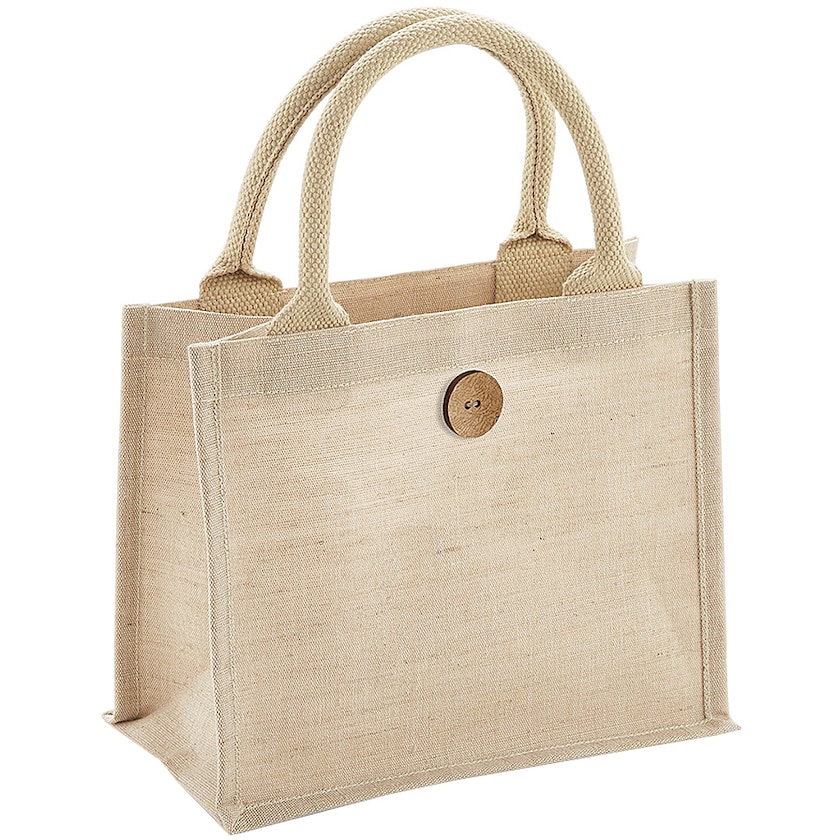 Piccola borsa fabbricata con tessuti naturali. Montagu è fabbricata in tessuto laminato d'alta qualità. 72% juta e 28% cotone. I manici sono realizzati in 100% cotone. Una piccola borsa in juta di qualità!