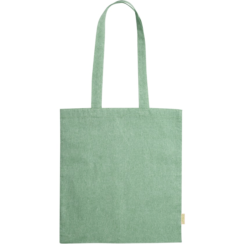 Borsa shopper in 100% cotone riciclato. Questa borsa è dotata di manici lunghi che consentono di portarla facilmente in spalla. Sul lato della borsa si trova un'etichetta che ne indica la composizione in cotone eco-compatibile.