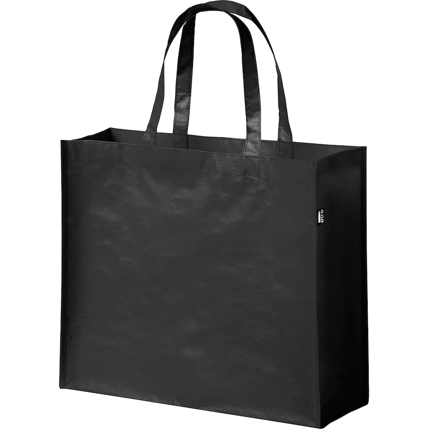 Borsa shopper laminata realizzata in rPET, ossia a partire da bottiglie in PET riciclate. Sul lato della borsa si trova un'etichetta che indica la sua composizione in rPET. La stampa può essere realizzata in massimo tre colori.