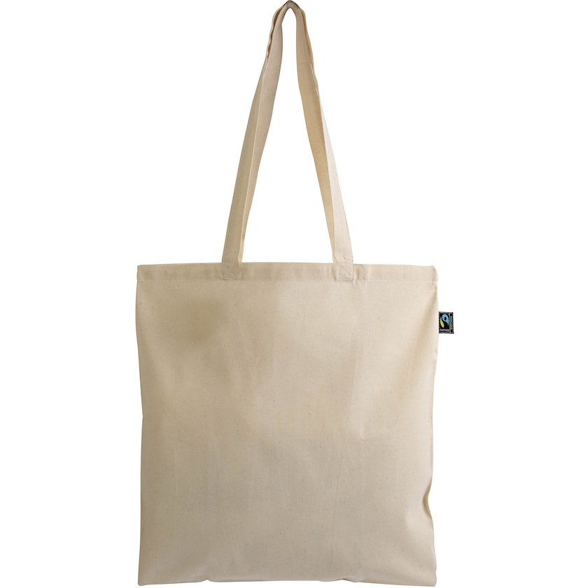 Shopper in cotone da 140 grammi certificato Fairtrade. Questa shopper è dotata di un fondo largo e di manici lunghi. Su di un lato della shopper si trova un'etichetta in tessuto che indica la certificazione Fairtrade.