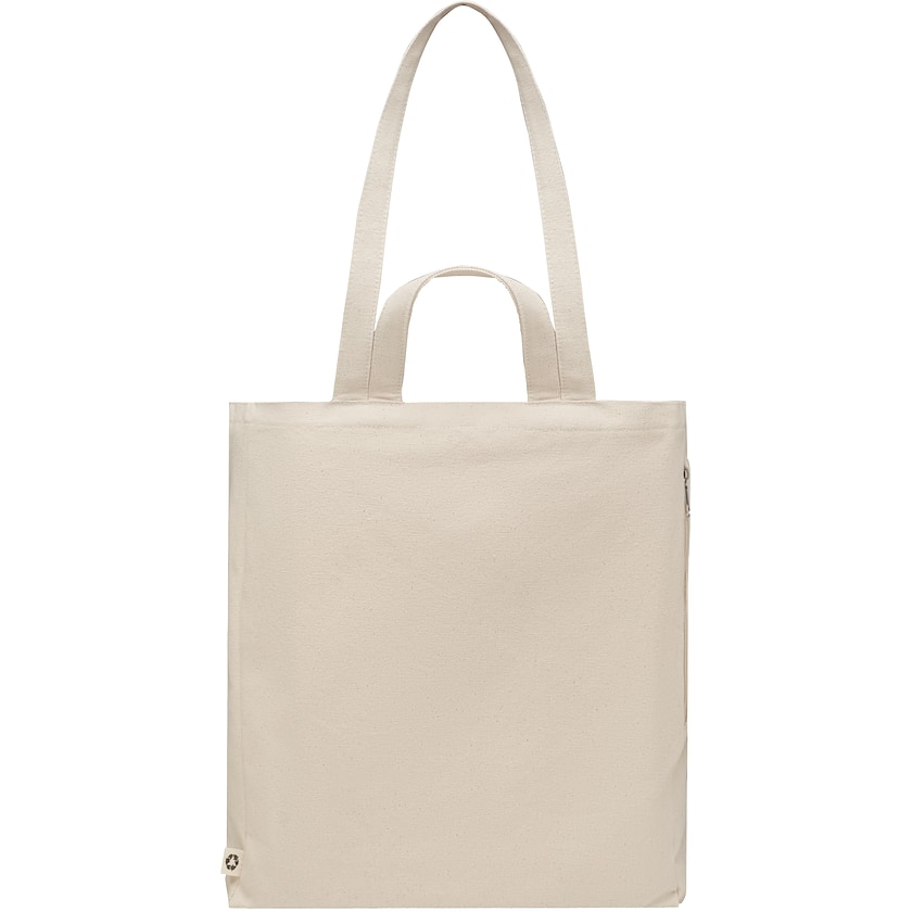 Shopper in misto cotone resistente. Brienz è realizzata in 70% cotone riciclato e 30% poliestere riciclato. Questa shopper è dotata sia di manici lunghi che di manici corti. All'interno si trova una tasca dotata di cerniera.