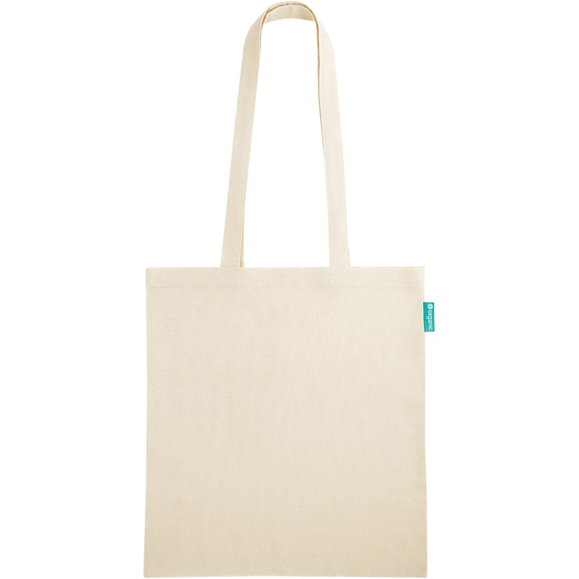 Shopper in 100% cotone biologico. Il cotone è prodotto in condizioni sostenibili, senza sostanze chimiche o pesticidi. I manici misurano 60 cm. Su di un lato si trova un'etichetta che indica la composizione in cotone biologico della shopper.