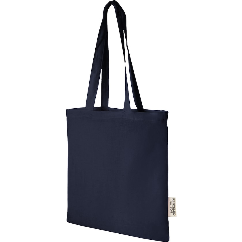 Shopper in cotone da 140 grammi in cotone riciclato certificato GRS. La shopper ha manici lunghi 30 cm che la rendono facile da trasportare.