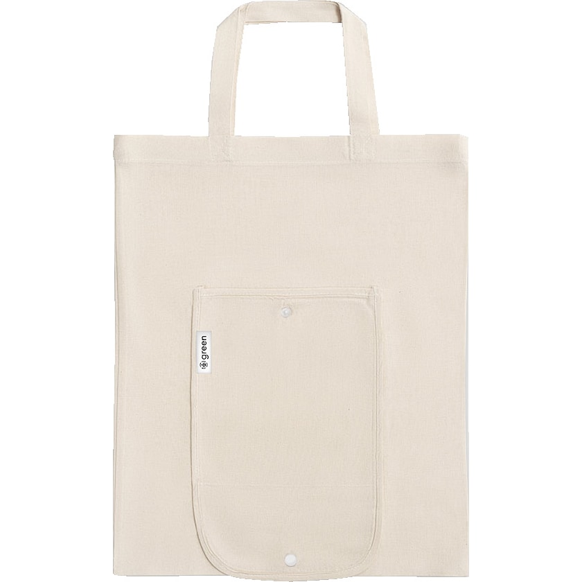 Shopper in cotone pieghevole in materiale riciclato. Il tessuto è realizzato in 50% cotone riciclato e in 50% normale cotone. I manici sono lunghi 38 cm.