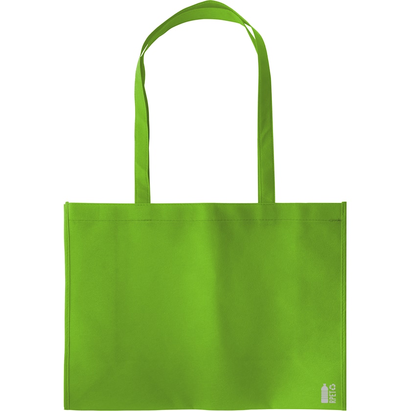 Shopper non-woven ecologica con fondo ampio e manici lunghi. La Vista è realizzata in rPET, ovvero PET riciclato. In un angolo si trova un simbolo che mostra che la shopper sia realizzata proprio in rPET.