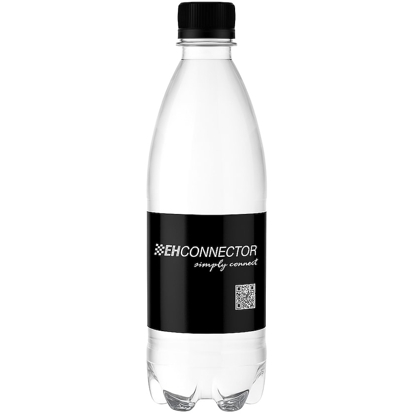 Bottiglietta d'acqua da 50 cl con etichetta bianca semplice. Scegli tra acqua naturale e frizzante. Il tappo è disponibile nei colori nero, bianco, blu e rosso.