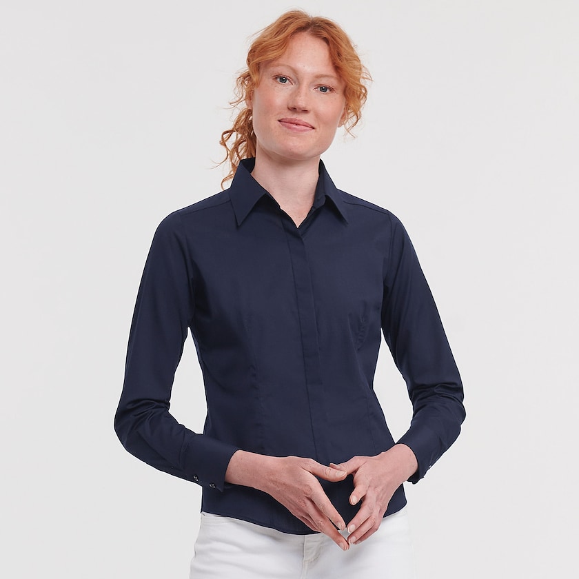 Camicia da donna a maniche lunghe in tessuto easy care. Questa camicia ha un taglio aderente che le dà un aspetto moderno. I bottoni sono nascosti. Viene confezionata singolarmente in busta di plastica. Disponibile anche in versione da uomo.
