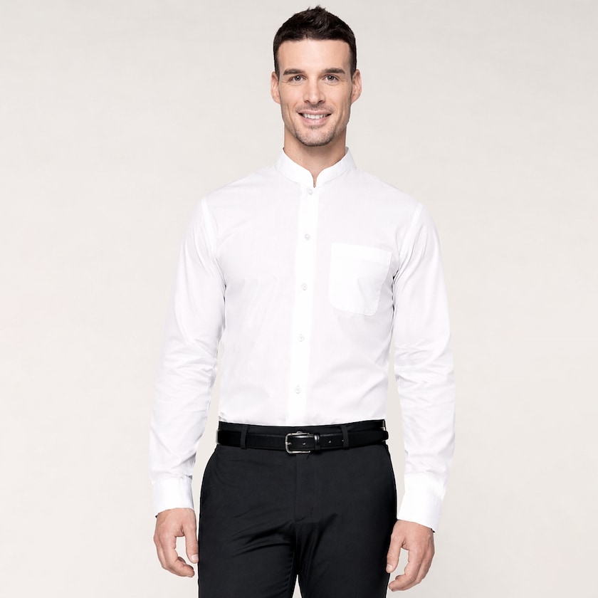 Camicia da uomo con colletto alla coreana. Questa camicia è realizzata in tessuto resistente e facile da pulire del tipo easy-care. Viene confezionata singolarmente in busta di plastica. Disponibile anche in versione da donna.