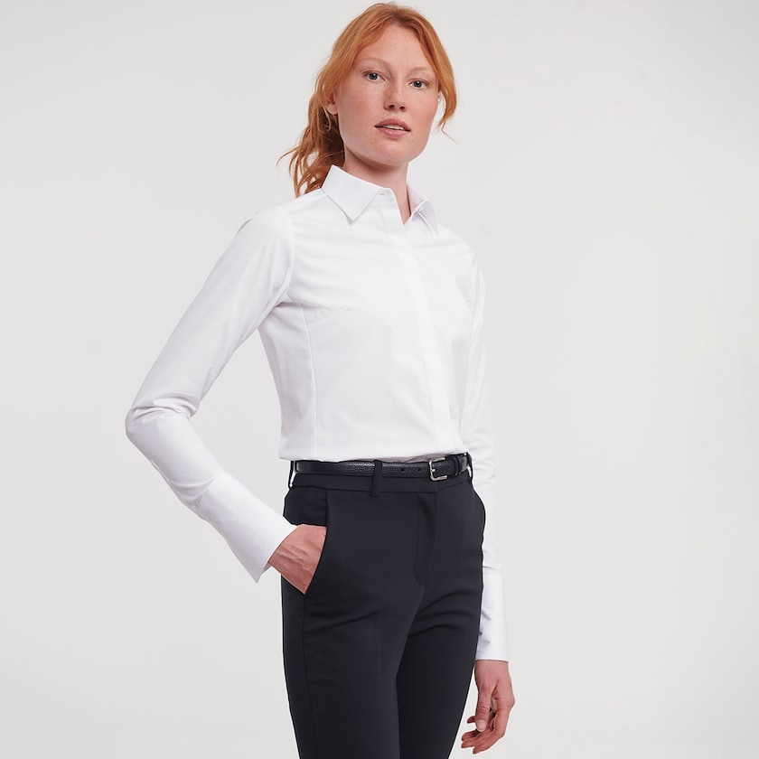 Camicia da donna di alta qualità in un tessuto elasticizzato unico. Il tessuto in cui è realizzata la camicia contiene il rivoluzionario materiale LYCRA T400 che la rende morbida ed elasticizzata. Si tratta inoltre di tessuto easy care che quindi raramente fa le pieghe. Viene confezionata singolarmente in busta di plastica. Disponibile anche in versione da uomo.