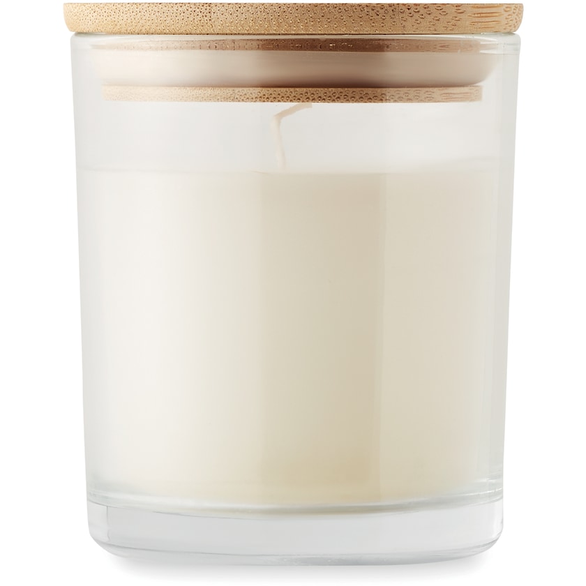 Candela profumata in vetro con tappo di bambù. Diffonde un meraviglioso profumo di vaniglia. Il tempo di combustione è di 20 ore. Consegnato in una confezione regalo bianca.